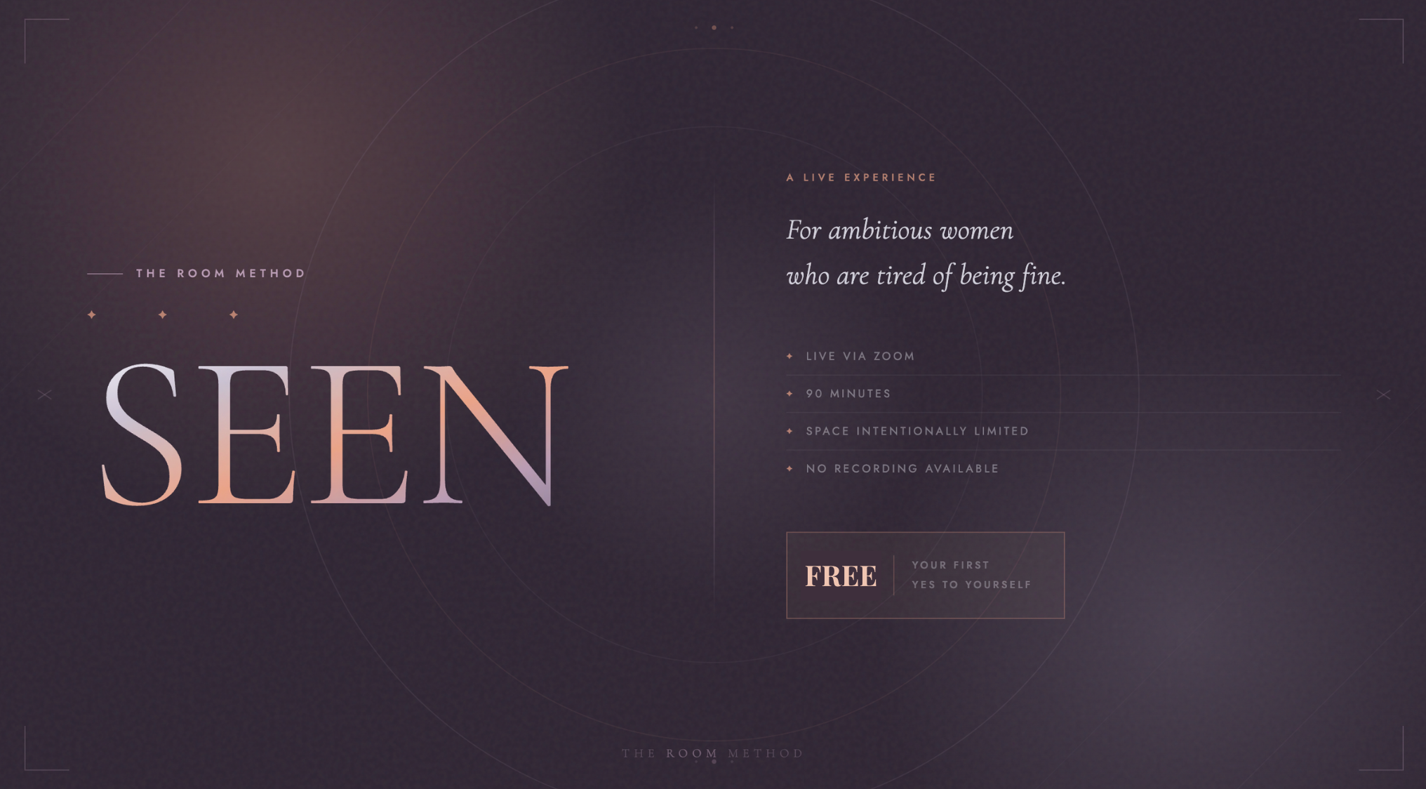 SEEN is a 90-minute live experience for ambitious, self-aware women who know they’re meant for more — but find themselves stuck at the threshold of the very thing they want most.
